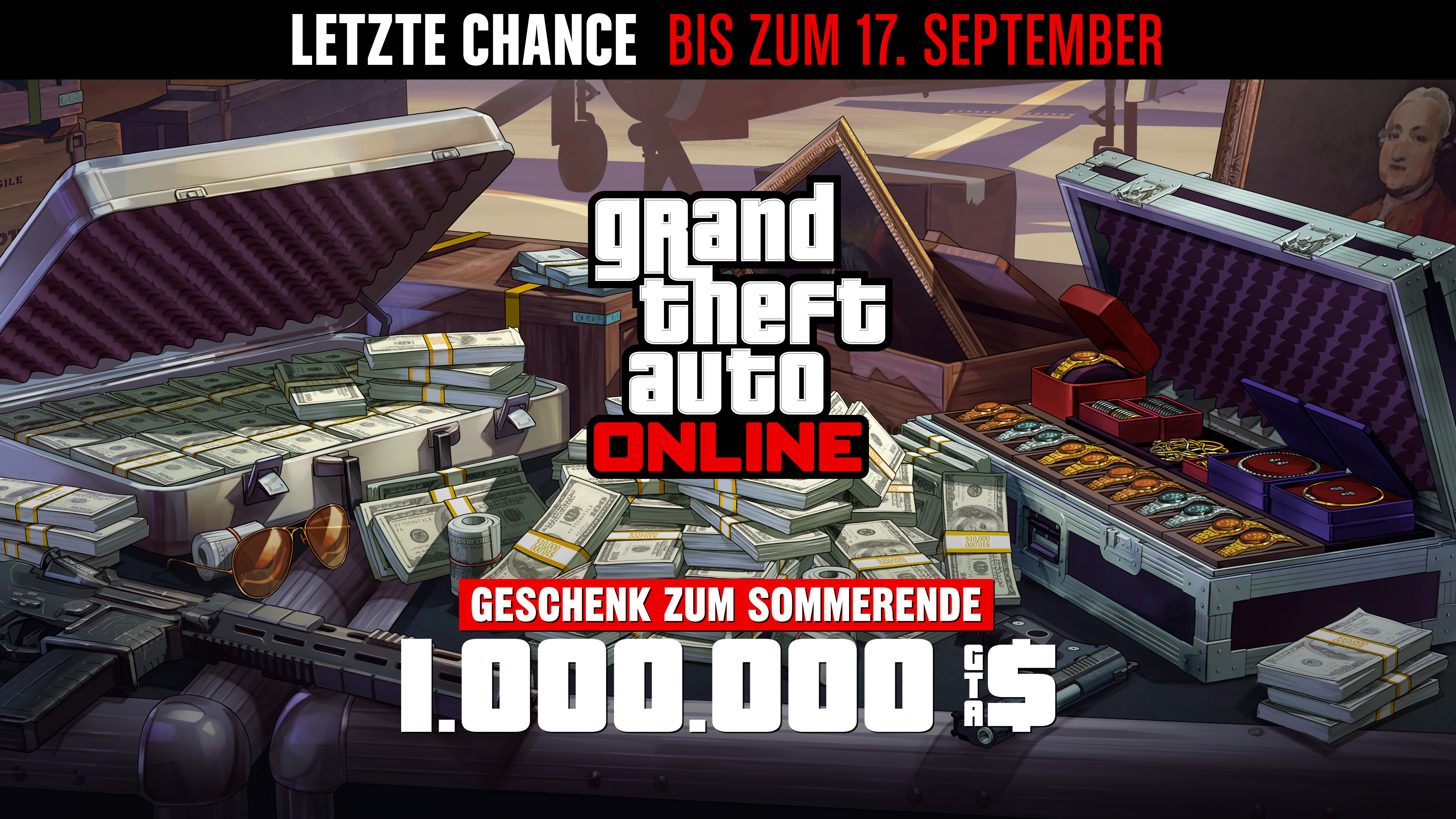 Diese Woche ist eure letzte Chance, bis zu 2.000.000 GTA$ im Rahmen des GTA$-Geschenks zum Sommerausklang zu kassieren. Meldet euch bis zum 17. September bei GTA Online an und sichert euch euren einmaligen Bonus in Höhe von 1.000.000 GTA$. Mit GTA+ verdoppelt ihr bis zum 17. September den Geldregen mit zusätzlichen 1.000.000 GTA$.